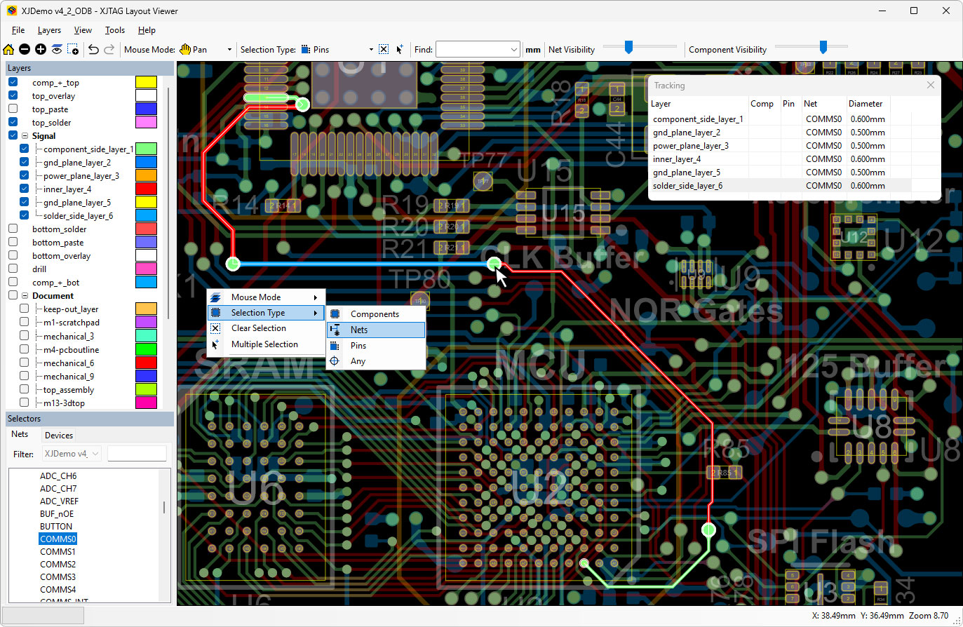 XJTAG Layout Viewer is a free, easy-to-use tool for viewing and inspecting PCB layouts using design data in ODB++ format, which can be exported from any of the major Electronic Design Automation (EDA) tools. It provides a clear and intuitive way to explore board layouts, helping you quickly locate components, pins and nets and understand board structure without the complexity of full CAD environments.